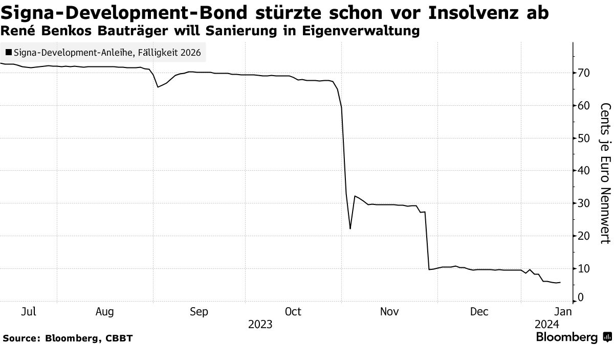这些债券现在的交易价格已经低于每欧元面值的6分钱。在申请破产之前,它们已经失去了大部分价值,其中包括Signa Development显然向姐妹公司提供了数亿欧元的资金。