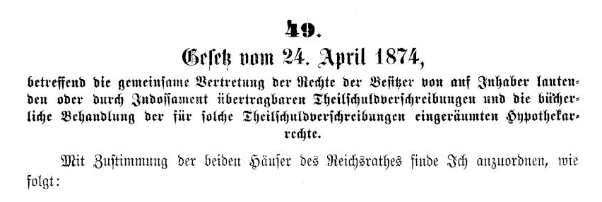 “Reichsgesetzblattes für die im Reichsrathe vertretenen Königreiche und Länder. XV. Stück. — Ausgegeben und versendet am 8. Mai 1874”来源:奥地利国家图书馆这项由弗朗茨·约瑟夫皇帝于1874年颁布的法律虽然很少被使用,因为在奥地利很少有带有债券的企业破产,但它总是让外国投资者感到困惑。其结果是,他们在破产或重组谈判时无法亲自参与。