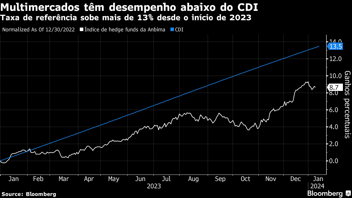 在12月份,Anbima的对冲基金指数,捕捉到一篮子多元化基金的表现,上涨了2.65%,是自2022年3月以来的最大月度涨幅。而CDI的基准利率在该期间内回报了0.90%。Anbima指数在2023年收盘时上涨了9.31%,而CDI上涨了13.05%。