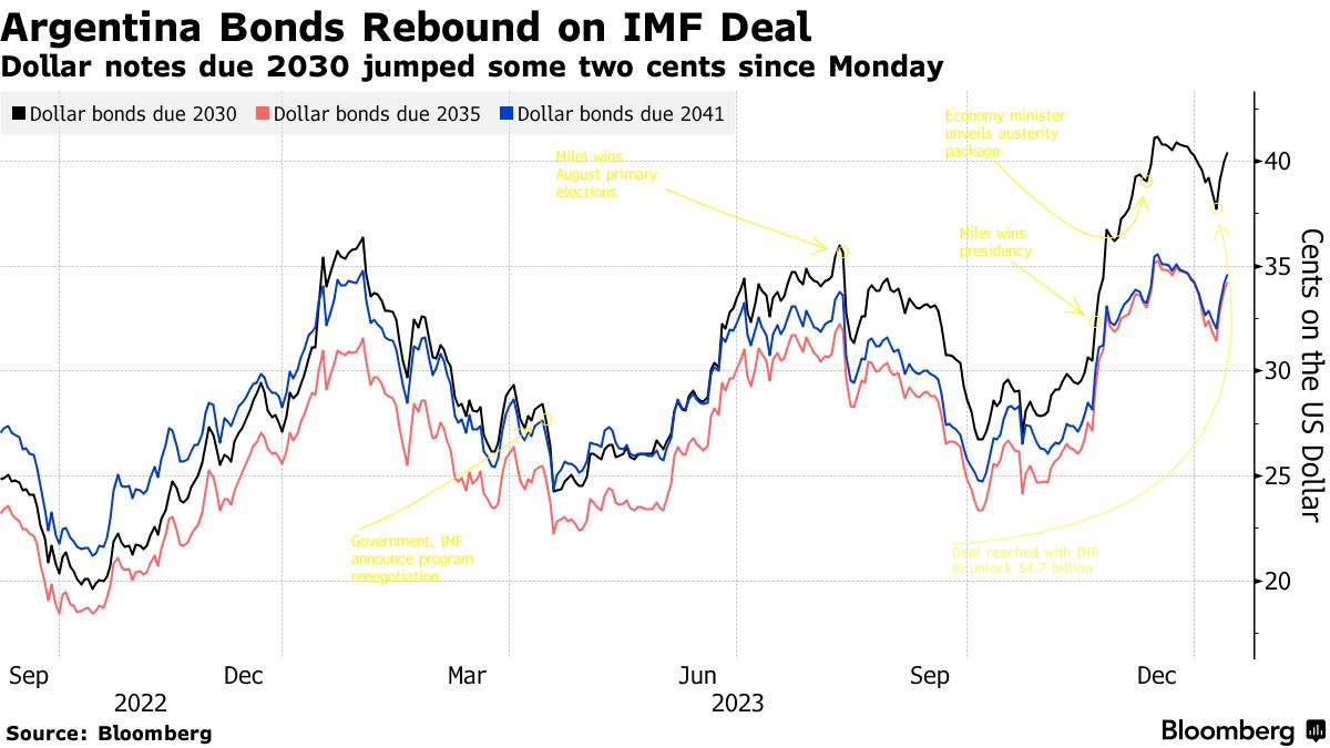 债券投资者打赌,在 Milei 和 Caputo 与国际货币基金组织达成工作层面协议后,还会有更多收益。该协议解锁了47亿美元的资金。如果基金的执行董事会批准该协议,将给 Milei 时间偿还贷款,然后再决定是继续留在前任达成的440亿美元计划中,还是谈判一项新计划。
