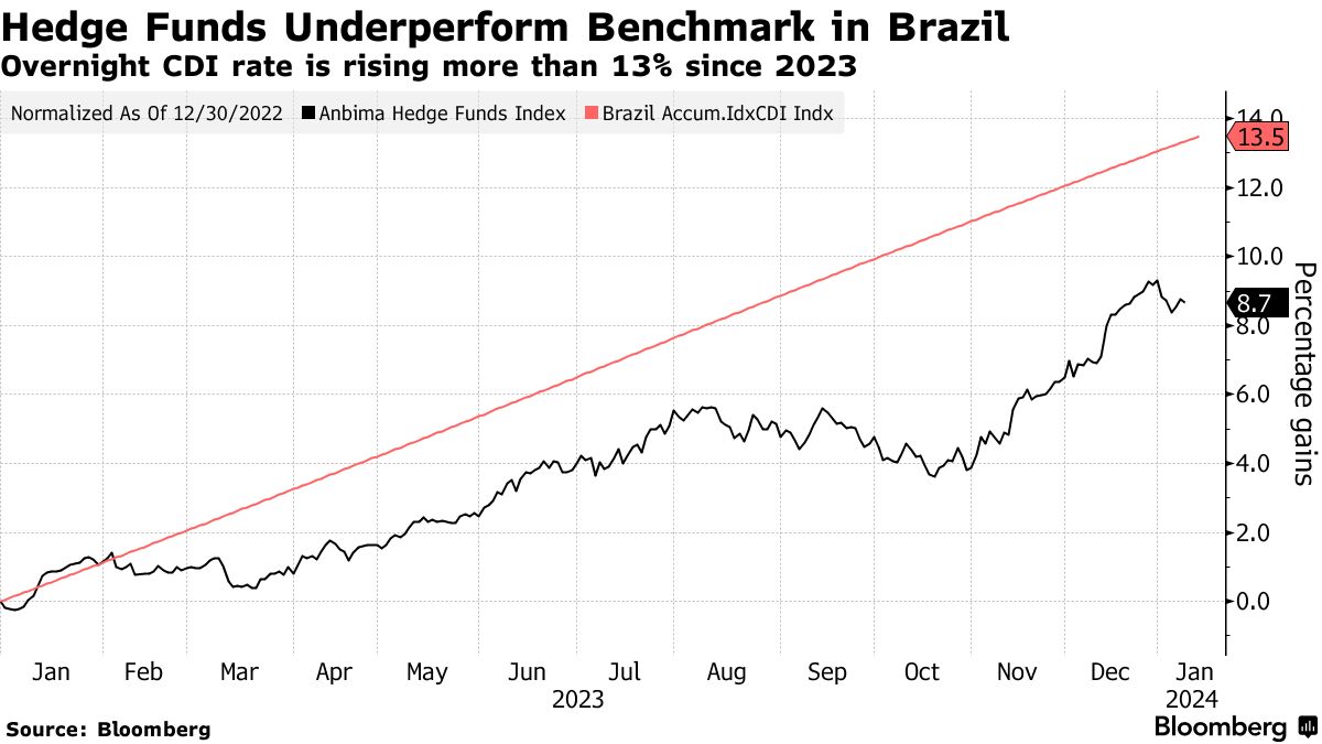 尽管乐观情绪在去年12月得到了回报 —— 一个被称为IHFA的本地对冲基金指数实现了自2022年3月以来的最大月度涨幅,远远超过了基准CDI利率 —— 但随后情况发生了变化。随着交易员重新定价美联储在3月份降息的可能性,新兴市场在年初的几个交易日中出现了下跌,美元走强和收益率上升。