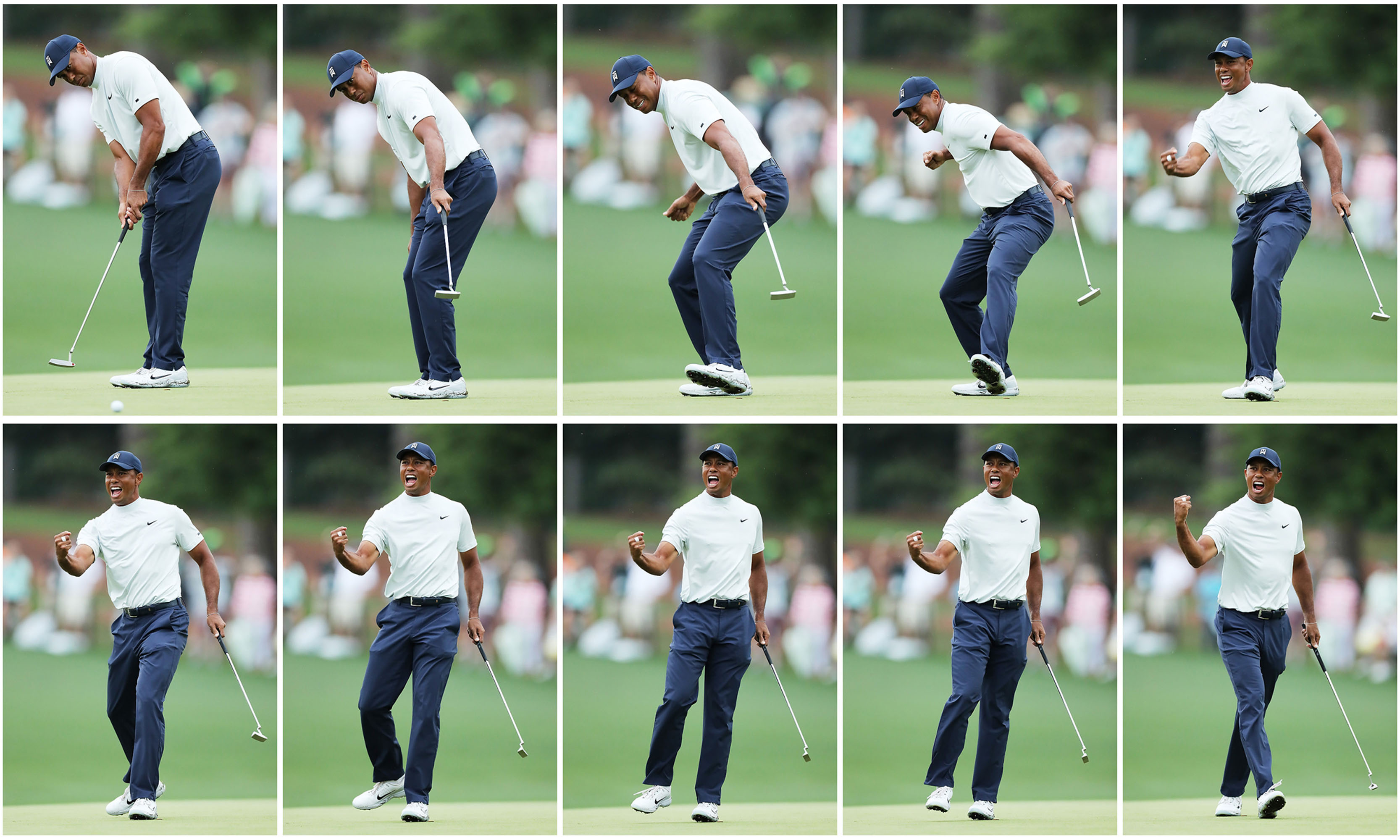 美国的老虎伍兹在2019年4月12日在乔治亚州奥古斯塔国家高尔夫俱乐部的第二轮大师赛上庆祝在第15号果岭上推入小鸟球后。