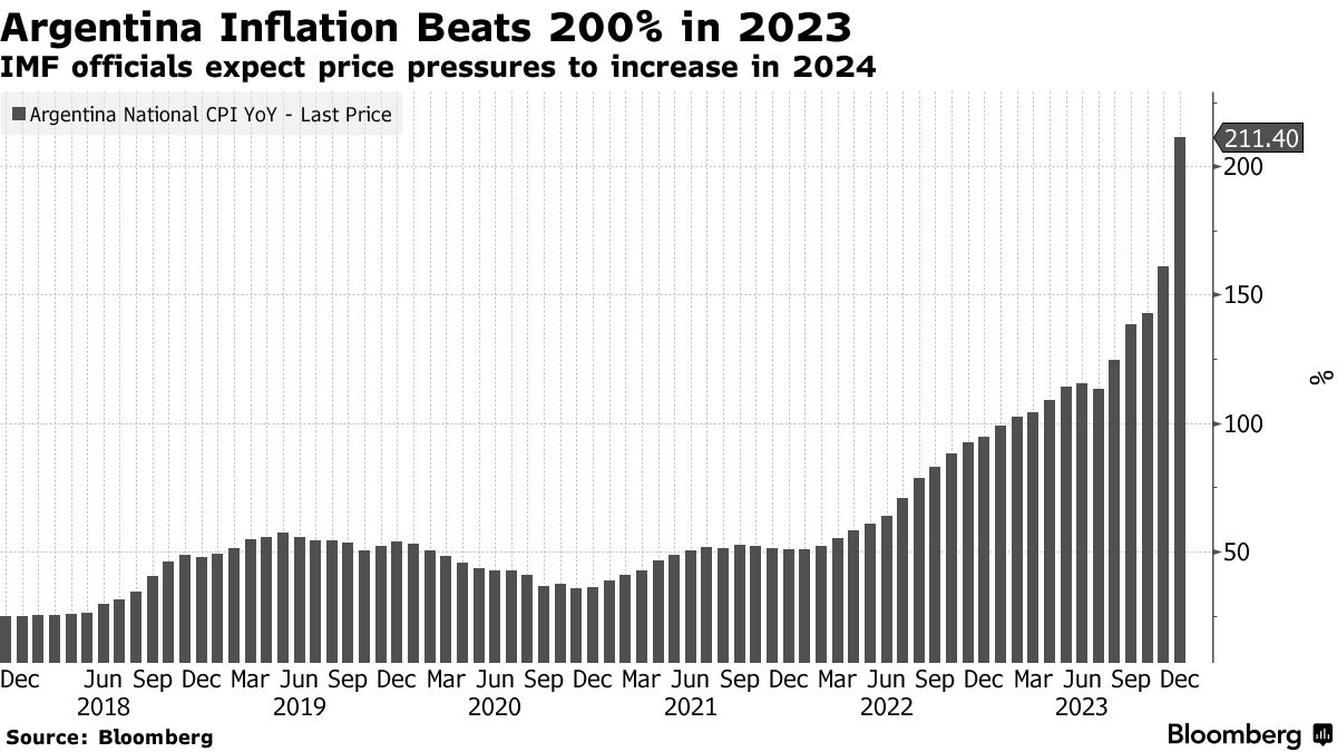 阿根廷以三十多年来最高的通货膨胀率结束了2023年,因为哈维尔·米莱开始取消前一届政府实施的一系列货币控制和价格冻结。国际货币基金组织对米莱的计划表示信任,于周三批准了其440亿美元计划的审查,为超出预期的47亿美元贷款拨款铺平了道路。