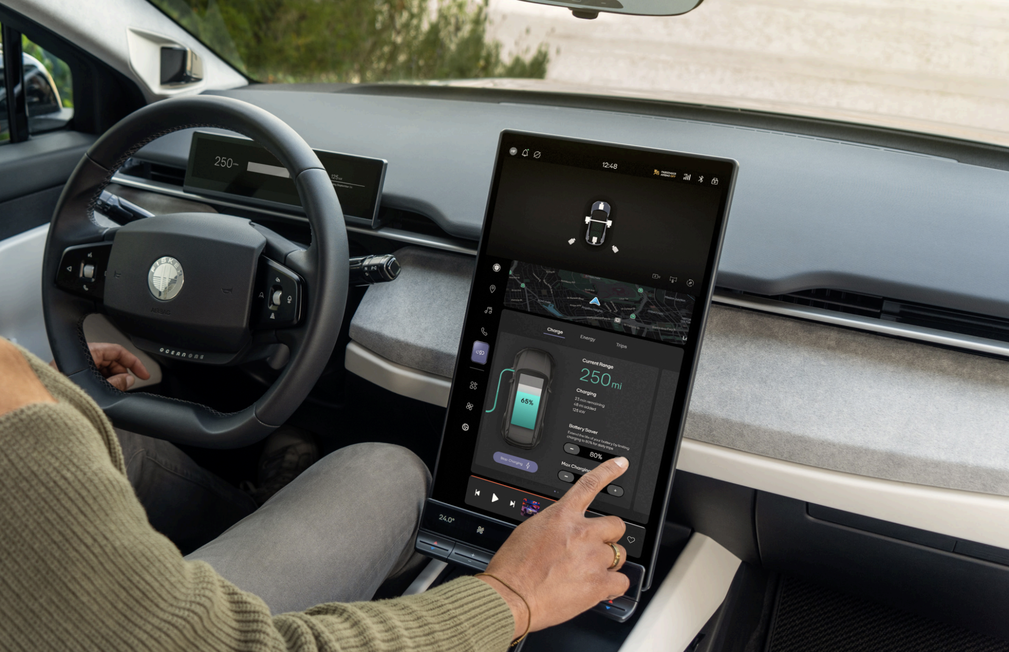 Fisker Ocean的中央屏幕可以从默认的垂直模式旋转到水平的“好莱坞模式”。摄影师:迈克尔·穆勒/Fisker在CARLAB,里巴斯说她和她的团队经常被汽车制造商要求尽可能多地塞满电动汽车的科技小玩意。她说,这是掩盖电动传动系统糟糕经济性的聪明办法,特别是电池的高成本。