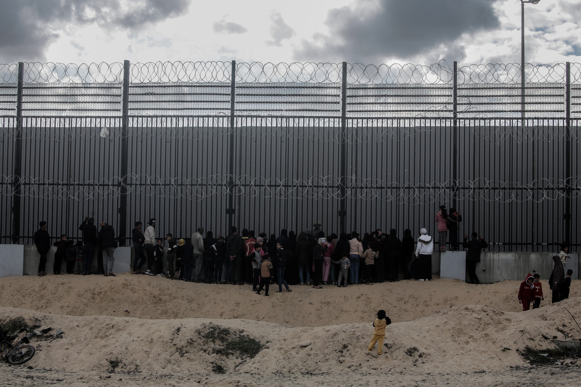 巴勒斯坦人在加沙拉法边境与埃及士兵交谈。