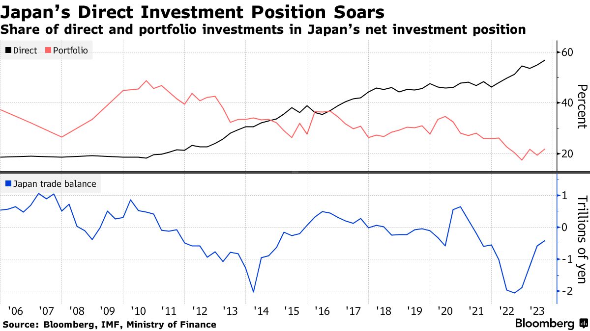 根据彭博编制的国际货币基金组织的数据,在第三季度,外国直接投资占日本净国际投资头寸的57%,而2010年底这一比例为20%。在此期间,组合投资的份额从46%下降到了22%。