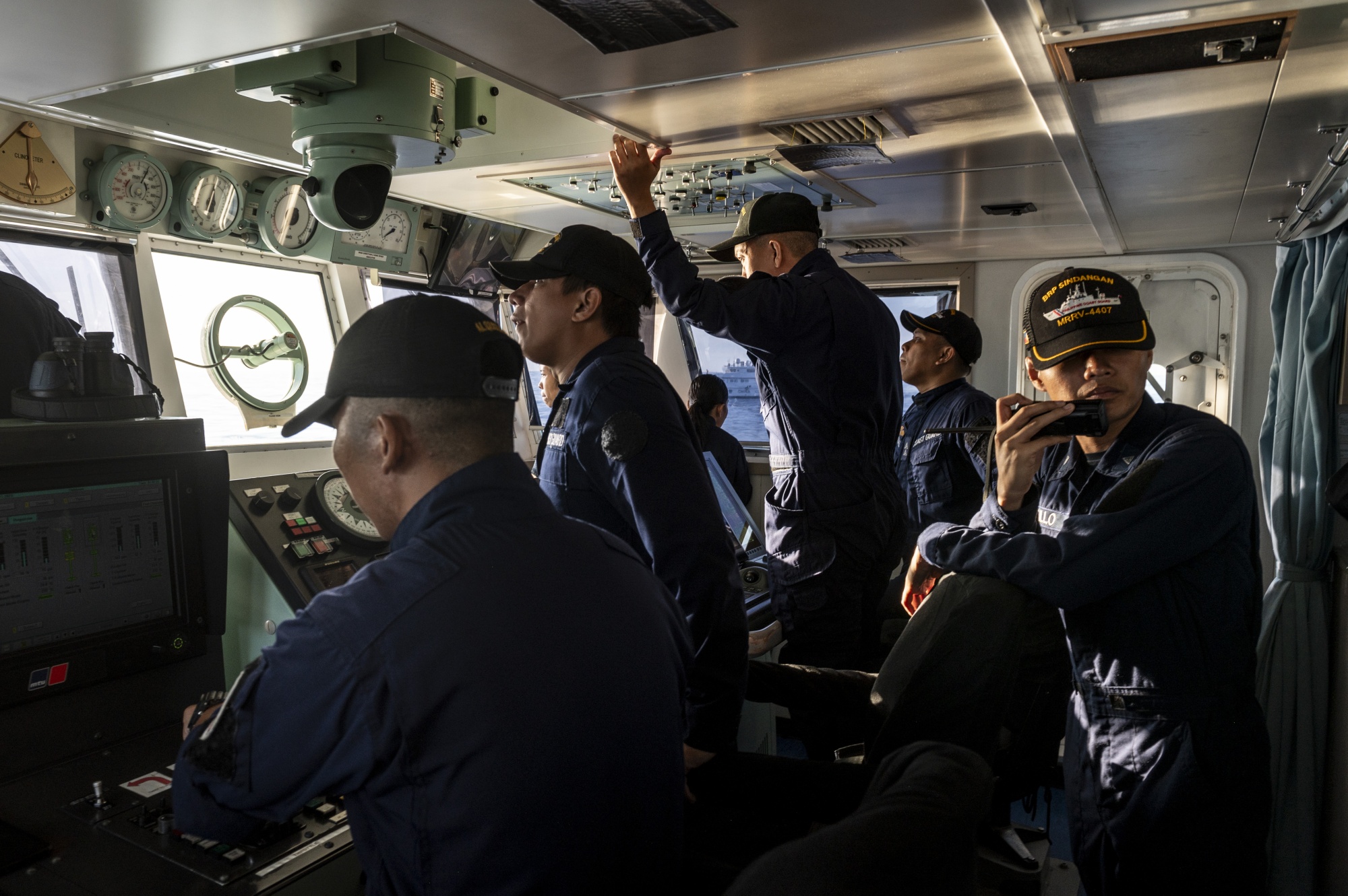 菲律宾海岸警卫队人员在11月份在南中国海有争议的第二托马斯滩进行补给任务时,乘坐BRP辛达甘号。