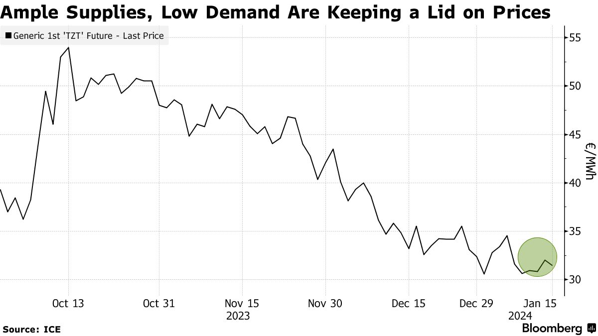欧洲天然气价格下跌,供应充裕压倒红海风险-彭博社