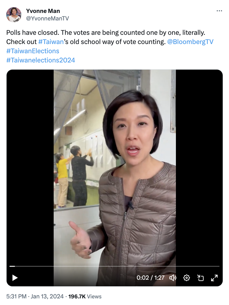 在周六晚上的所有兴奋中,我们注意到人们对台湾非常透明的计票过程表现出了极大的兴趣。从新北市一个投票站外,彭博电视的Yvonne Man向世界展示了这个老式的过程,包括纸张、白板和大声喊叫。公众可以观看整个过程,并指出任何可能的差错。点击下方观看。