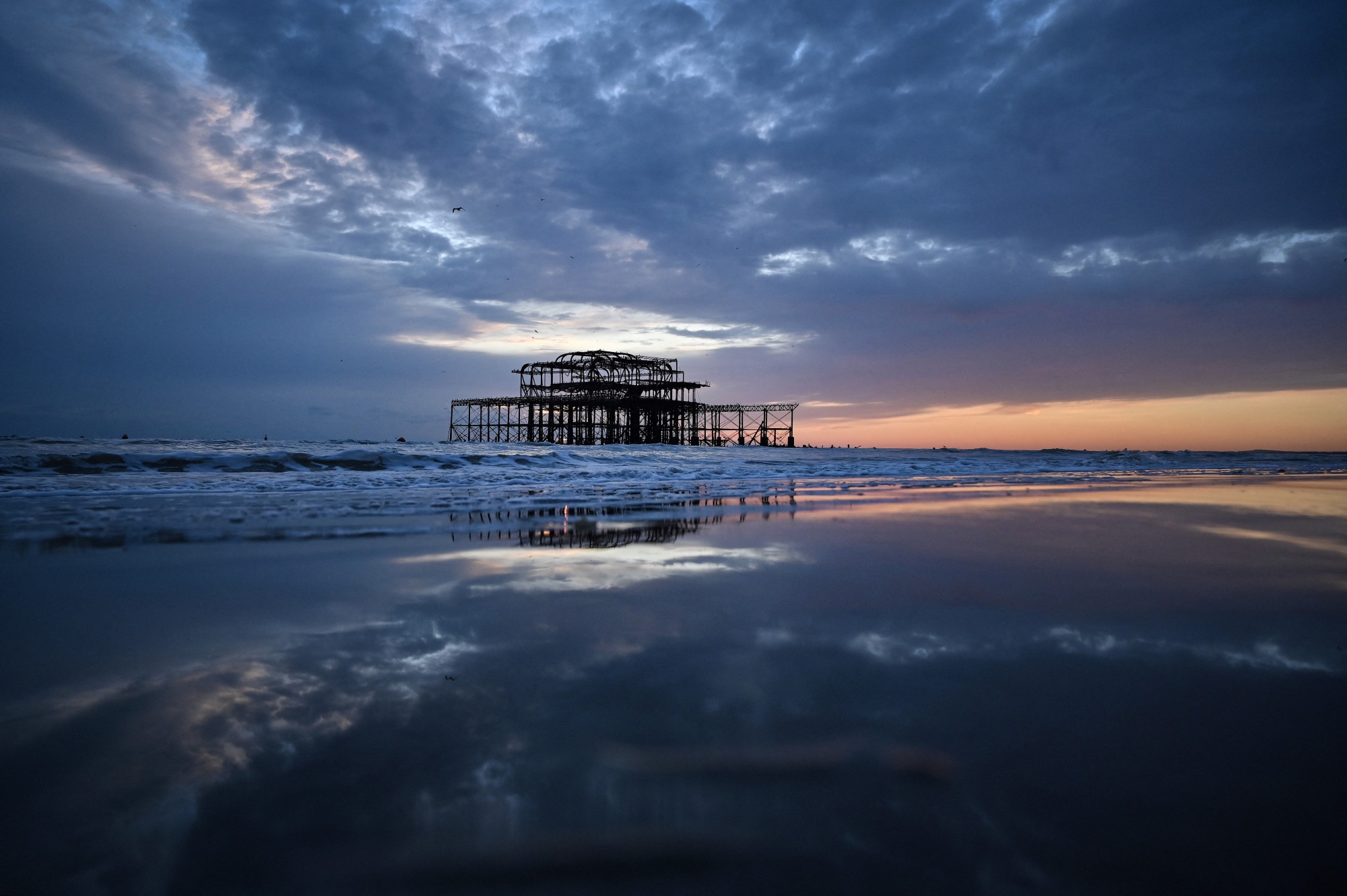 太阳在寒冷的天气中在布赖顿的西码头后落山。