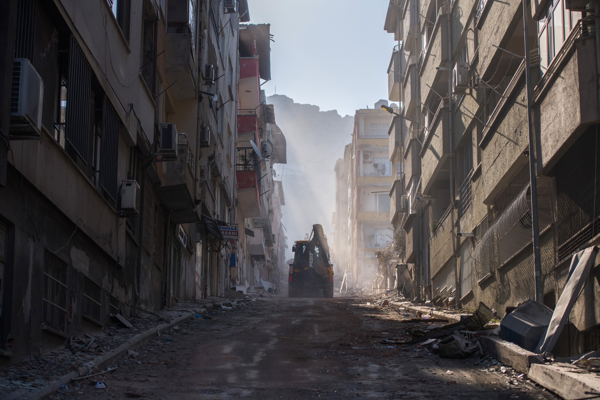 2023年2月,土耳其哈塔伊一条街上,一台挖掘机停在受损的住宅公寓楼旁。