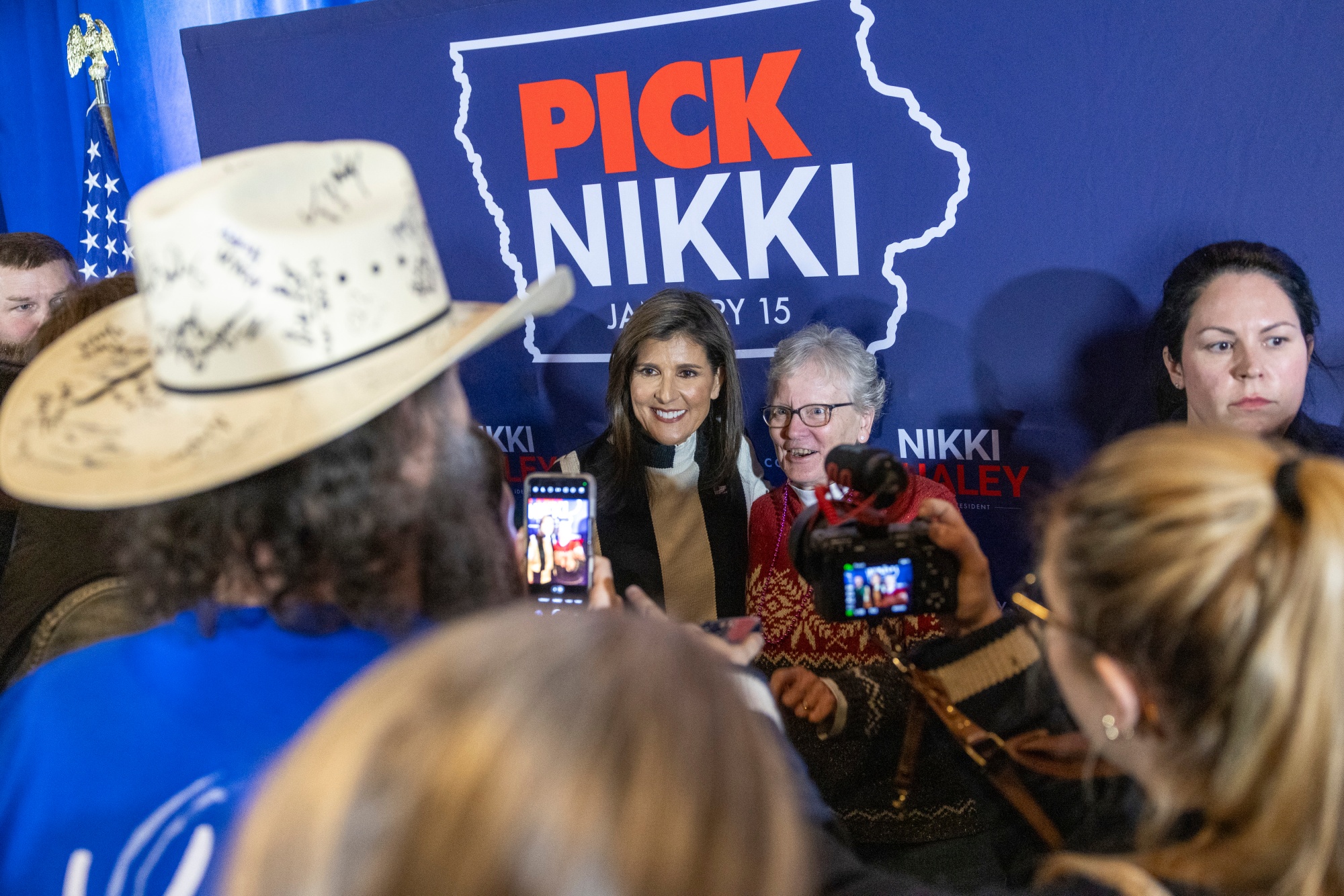 尼基·黑利,前美国驻联合国大使兼2024年共和党总统候选人,在爱荷华州埃姆斯市的一次竞选活动中向与会者致意。