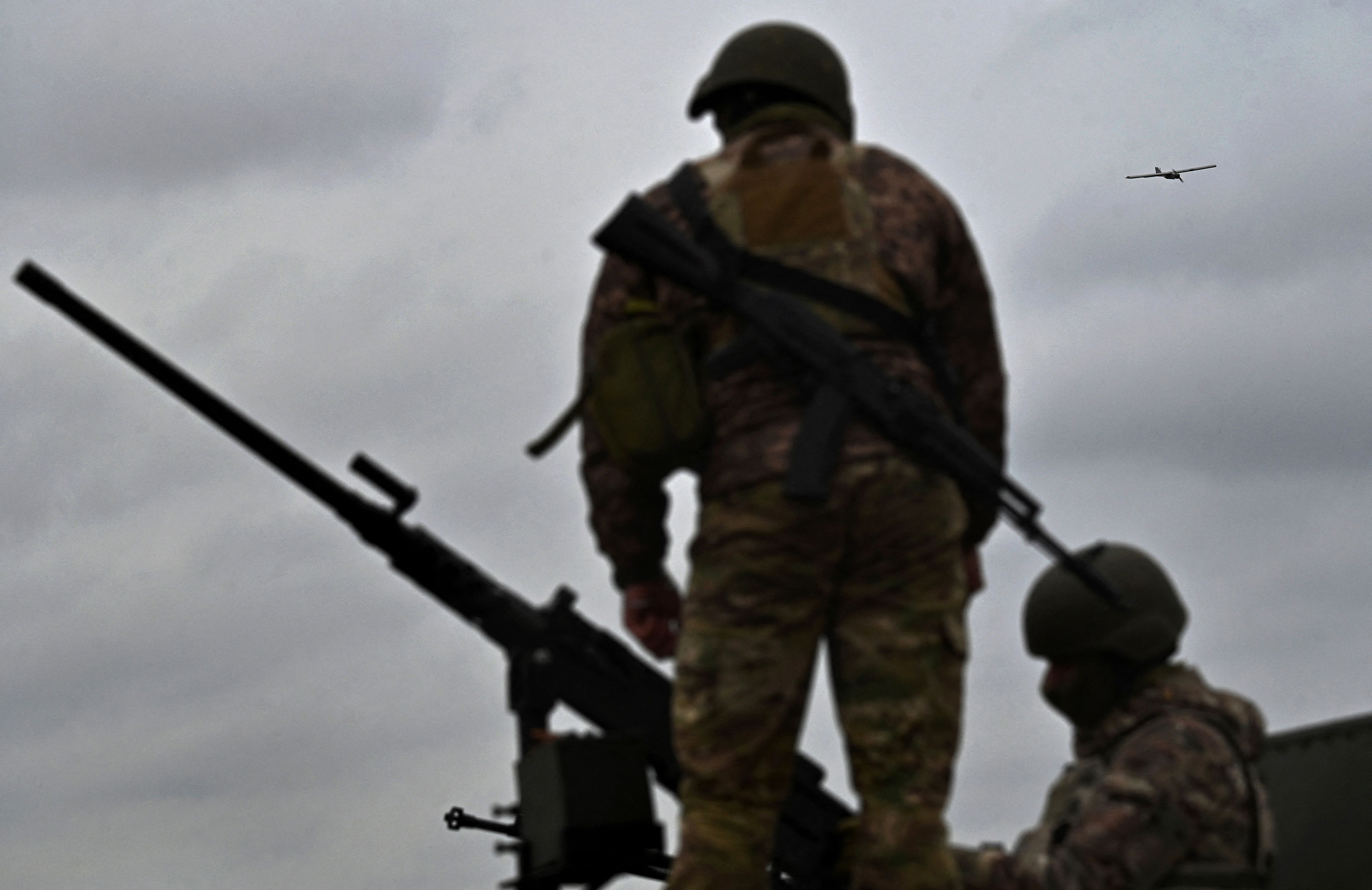 乌克兰军人在乌克兰切尔尼戈夫地区进行反无人机演习时操纵一挺机枪。