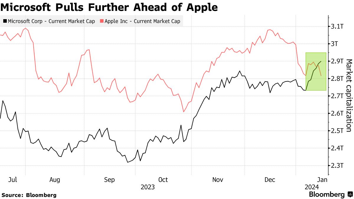 周二,微软公司股价上涨,而苹果公司股价下跌,这家软件巨头正在扩大其对iPhone制造商的市值领先地位。微软股价最高上涨了1.4%,而苹果股价最高下跌了2.7%。这些变动导致微软的市值达到2.93万亿美元,高于苹果的2.82万亿美元。