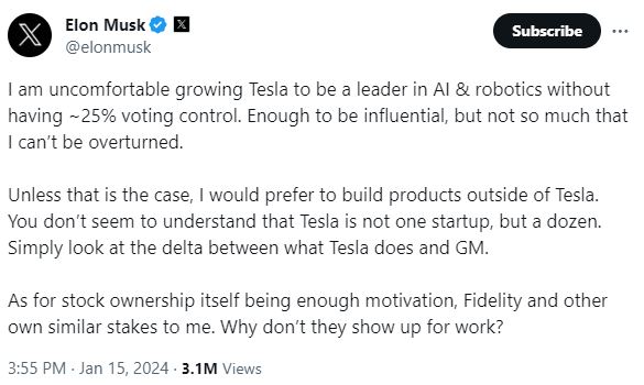 有很多种解读埃隆·马斯克关于他为什么应该控制特斯拉公司25%的推文:推文。