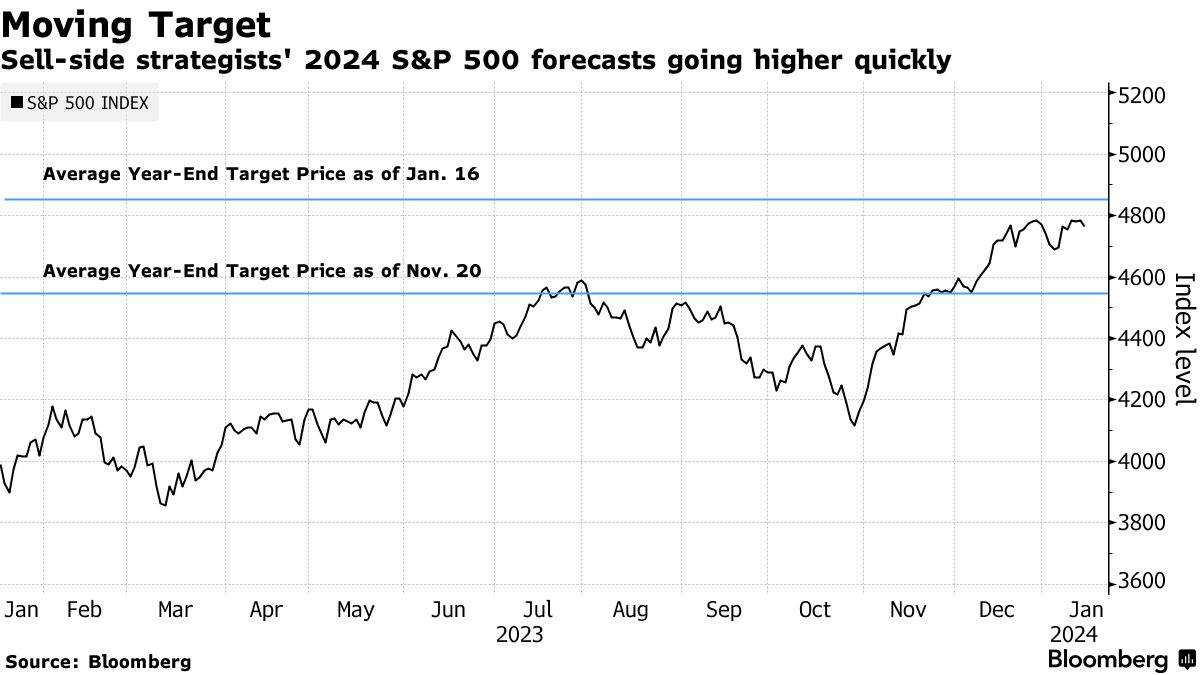 彭博跟踪的卖方策略师的平均目标现在截至1月16日为4851点,而去年11月底时为4546点。