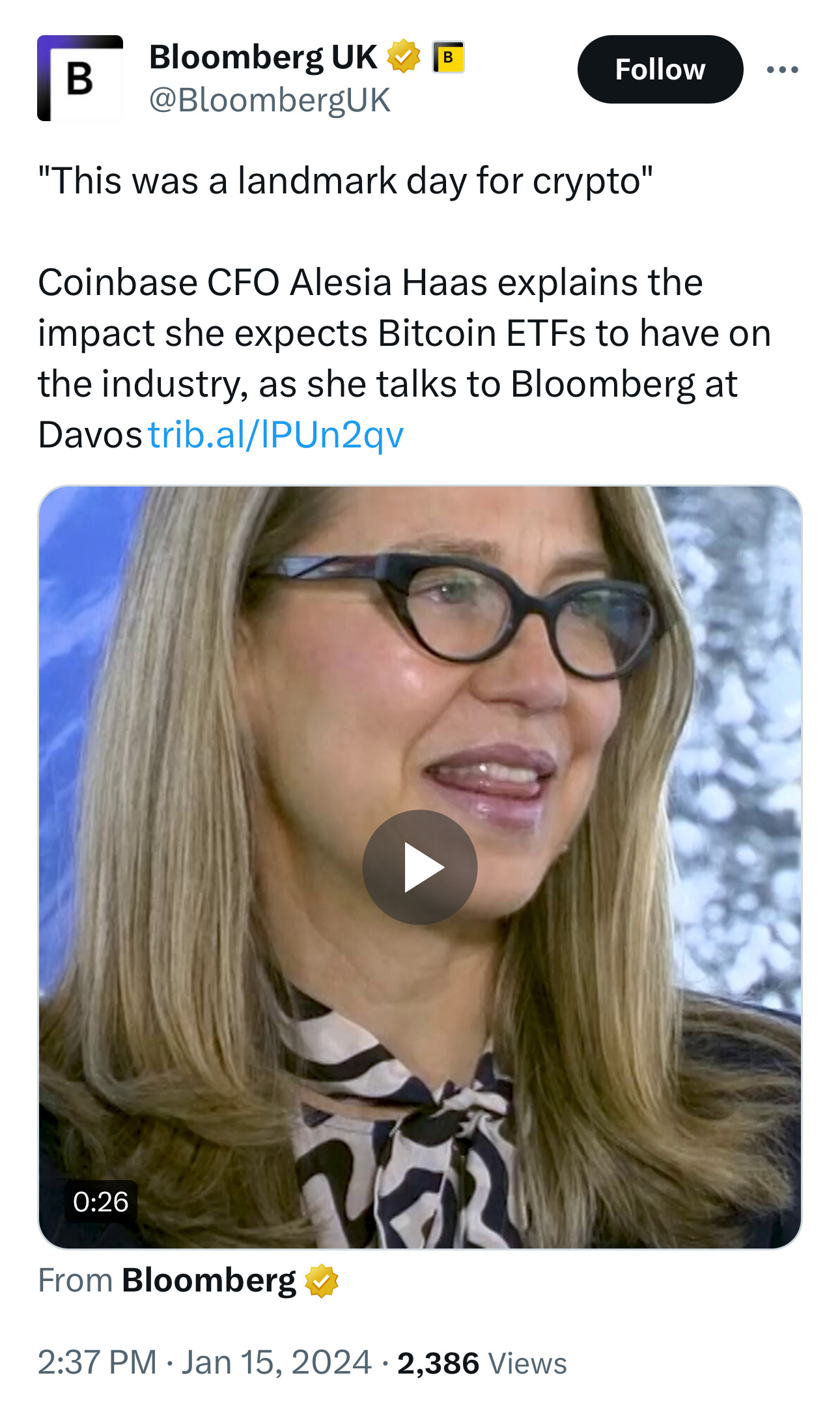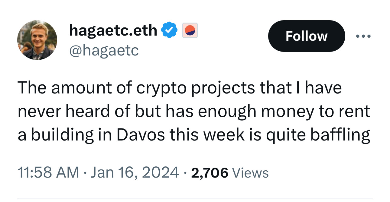 来源: @hagaetc.eth on X](https://twitter.com/hagaetc/status/1747226857517252939)世界经济论坛与加密货币所谓的反建制精神毫不相称。这有点像“反对权威,除非是达沃斯人。”事实上,包括Grayscale的 Michael Sonnenshein、Circle的Jeremy Allaire和Coinbase的Alesia Haas在内,几位知名的加密货币高管今年都前往了达沃斯。Ripple将由达沃斯的常客Brad Garlinghouse以及其总裁Monica Long代表。旅行预算似乎反映了加密货币今年相对强劲的开局。在接受彭博电视采访时,Coinbase首席财务官Haas强调了美国证监会(有些勉强的)决定允许现货比特币ETF在美国交易的重要性。她称之为加密货币的“里程碑式的一天”,强调了这些ETF解锁资产类别中“数万亿美元”的额外投资潜力。暗示,暗示。对于加密货币高管来说,将有许多机会与涌入这座山城的交易商和政策制定者交往。尤其是在斯卡拉穆奇葡萄酒派对,据说再次成为城里最热门的门票之一。