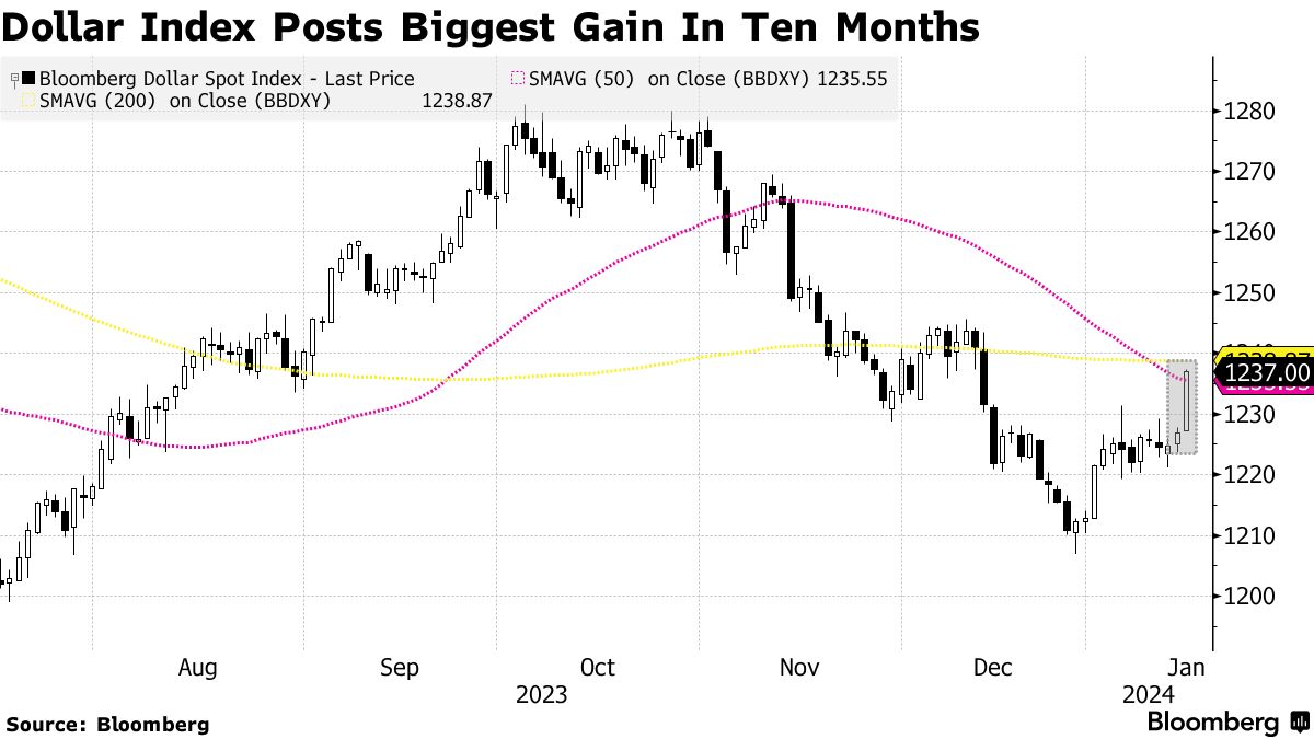 债券市场对美联储降息预期进行了重新调整。美国国债下跌,使得10年期国债收益率周二上涨了约12个基点。利率交换市场对3月降息的定价从周五的80%略微下降至约65%。