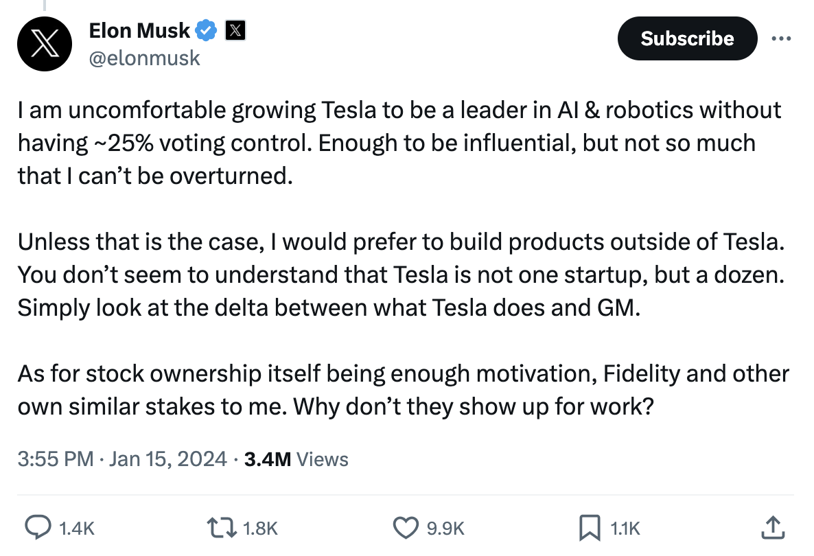 在某种程度上,马斯克提出了一个相当聪明的威胁,Matt Levine认为。“如果你是特斯拉的董事会,而且你知道埃隆·马斯克现在的头等大事是建立人工智能,你是不是更希望他在特斯拉做这件事,而不是在其他地方?想必你希望他关注特斯拉——这就是为什么你支付了数十亿美元让他成为特斯拉的CEO!——所以如果他把所有注意力转移到其他地方,你会感到难过。”