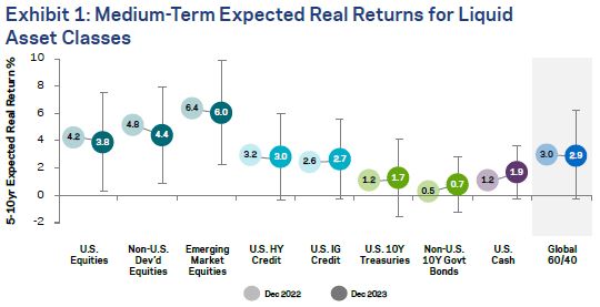 这意味着中期美国国债的预期实际回报率为1.7%。对于美国股票,现在是3.8%。这些调整意味着AQR对未来五到十年内60/40投资组合(传统配置,包括60%股票和40%债券)的业绩估计大致保持在2.9%。