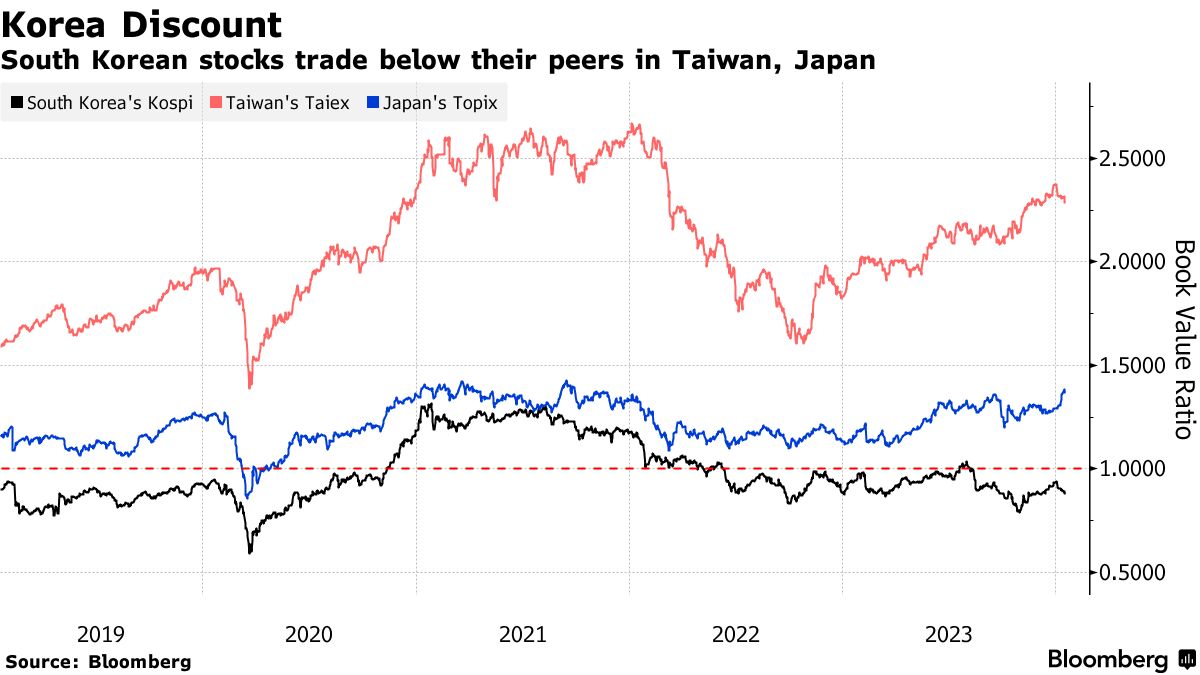 韩国上市公司的股价一直低于海外同行。韩国综合指数的账面价值为0.89倍,而台湾和日本的基准指数都超过1。