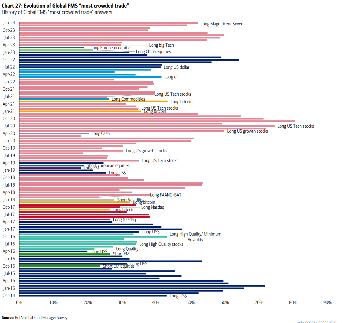 这是一个非常特别的图表。它显示了调查者认为在任何特定时刻最拥挤的交易。令人惊讶的是,如果你回顾到2017年中期,几乎每个月最拥挤的交易都是某种形式的“做多大科技”。有时是做多辉煌七(如今)。有时是做多美国科技股。有时是做多FAANG或做多纳斯达克。但基本上在6.5年多的时间里,通过多次周期波动(零利率政策,非零利率政策等),科技不仅一直很热门,而且被认为是拥挤的。