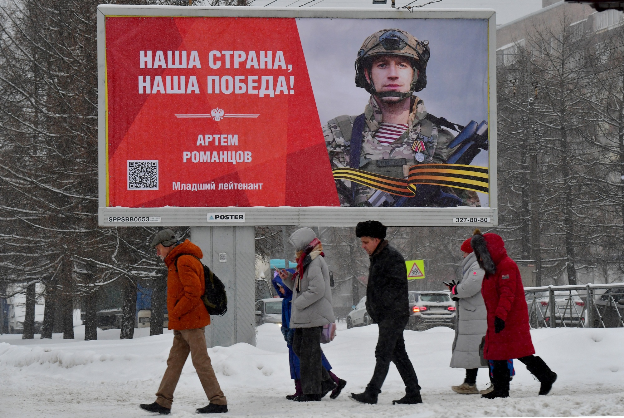 人们在圣彼得堡路过一块写着“我们的国家,我们的胜利!”的广告牌,摄于1月16日。