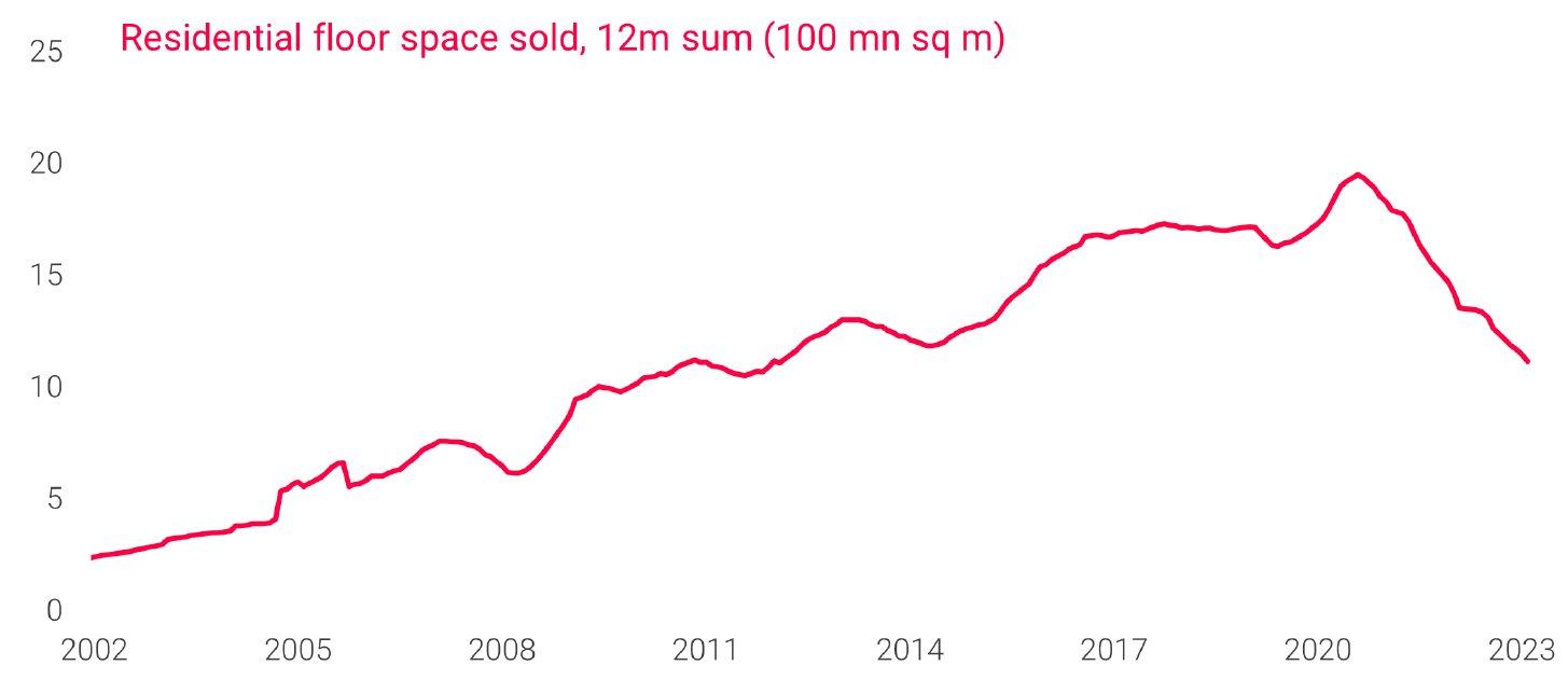 另一个表明这一下降有多么严重的指标是,TS Lombard提供了过去20年住宅销售面积的图表。销售现在已经回落到十年前的水平:
