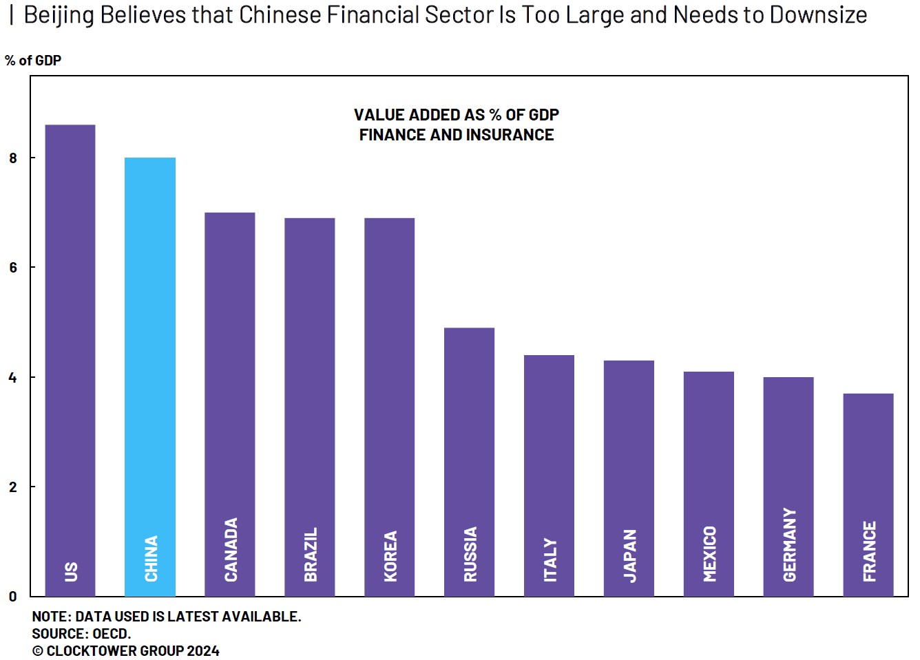 中国当局长期以来一直担心可能发生类似2008年雷曼兄弟破产后的危机,并且似乎决心阻止金融部门进一步扩大。帕皮奇指出,目前,中国的金融部门几乎像美国银行体系在国内一样占主导地位: