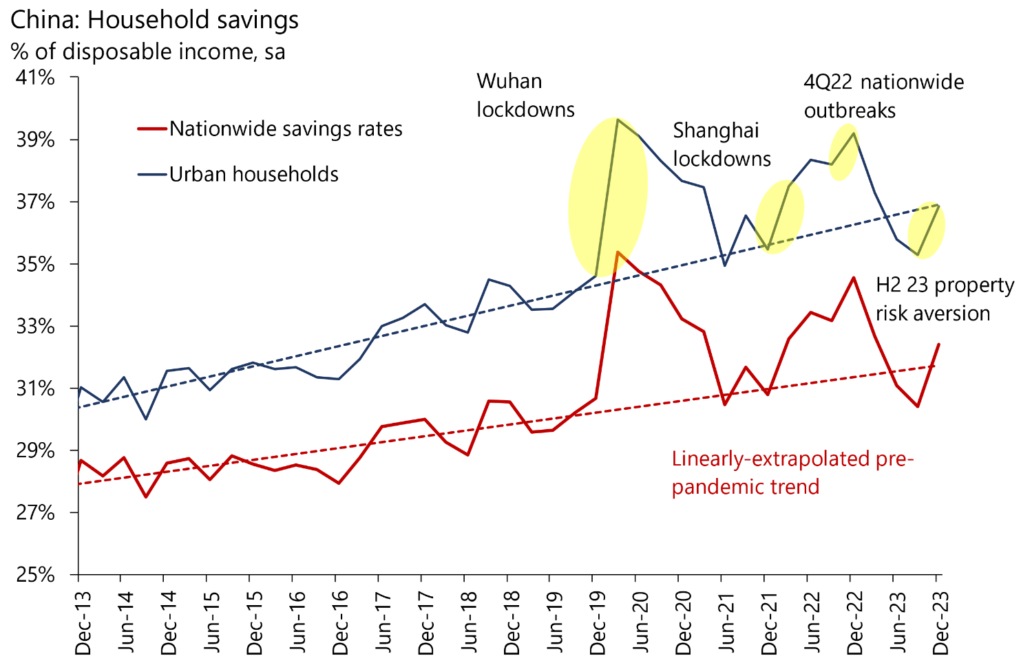事实上,中国消费者在经历了严格的零Covid封锁不到一年后,再次提高了储蓄率。房地产价格下跌使人们感到财务上不太安全,这可能是原因。牛津经济学院对此进行了说明:
