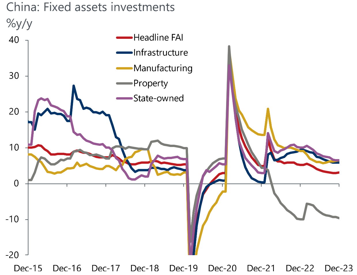 抑制经济复苏的因素之一,确实是房地产行业。这一直是经济的主要阻力。官员们一直在加大对那些难以偿还债务和完成项目的开发商的压力。即使中国承诺满足所有房地产开发商的“合理融资需求”,一些人仍然不确定这些努力能否缓解资金紧张。正如牛津经济研究所的路易丝·卢(Louise Loo)展示的这张图表所示,房地产行业一直是中国投资中迄今为止最薄弱的环节: