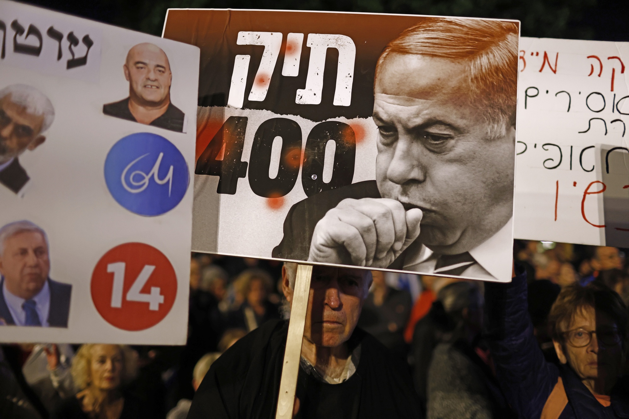 2024年1月6日星期六,在特拉维夫举行的反政府抗议活动中的示威者。