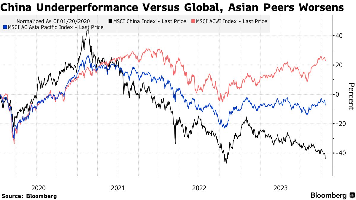 一系列因素导致了这一看似无休止的抛售,从房地产市场的深度下滑到顽固的通缩压力,以及对北京不愿采取积极的货币和财政措施刺激增长的失望。对美国利率走势的不确定性、本地股票衍生品迫在眉睫的爆炸威胁以及对更严格监管监督的担忧都加剧了悲观情绪。