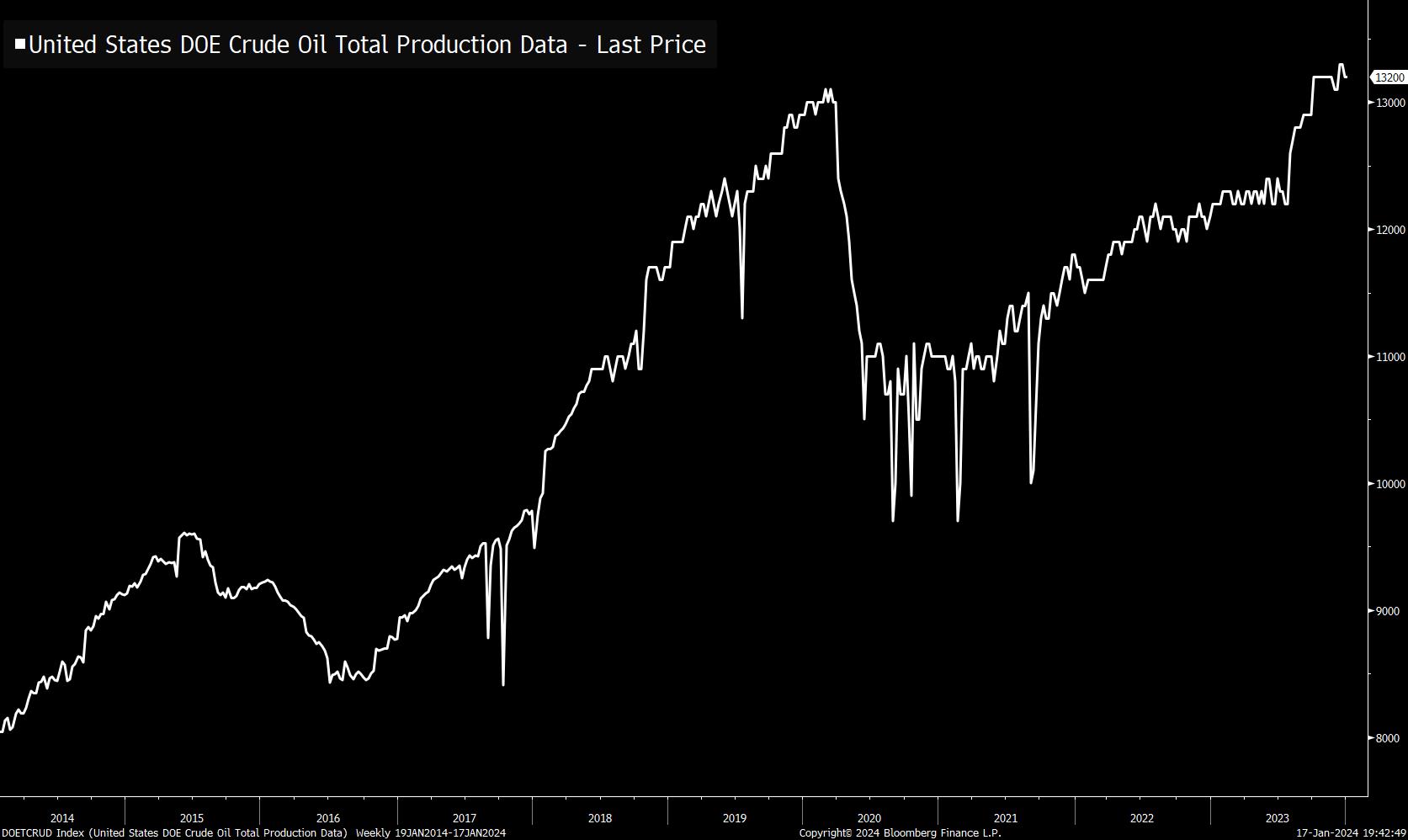 我之前发布过这张图表,但我再次发布它是因为它非常引人注目。尽管过去几年一直有关于国内参与者专注于盈利而非产量的种种讨论,以及有关拜登政府阻碍该行业发展的各种言论,但美国石油产量却达到了创纪录的高位。