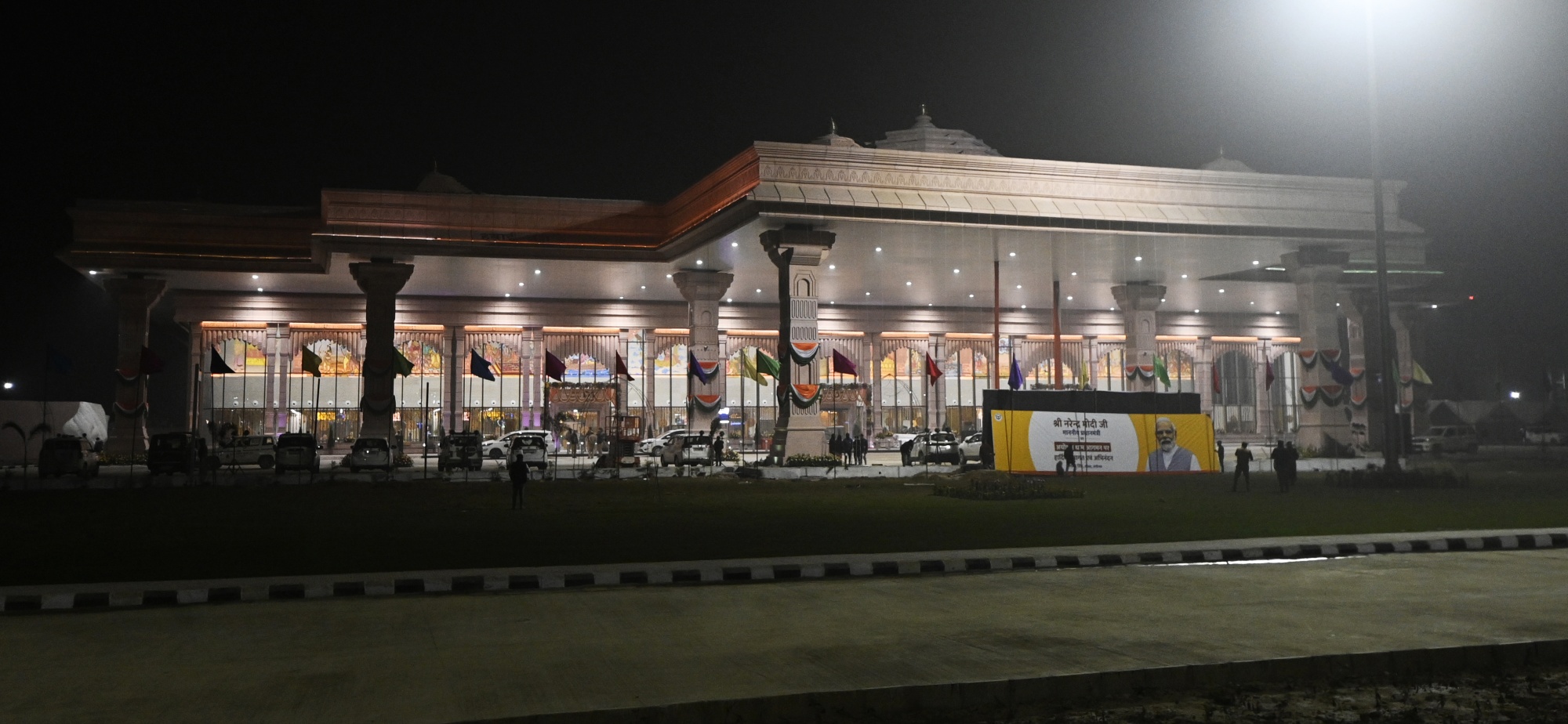 马哈尔希· 瓦尔米基国际机场 阿约提亚。摄影师:印度斯坦时报/印度斯坦时报这座备受争议的庙宇的开幕式,尚在建设中,标志着莫迪的人民党长期以来的竞选承诺的完成。其时机恰逢大选前几个月,宗教领袖和反对党政客对此并不陌生 — 其中一些人已经拒绝出席活动。