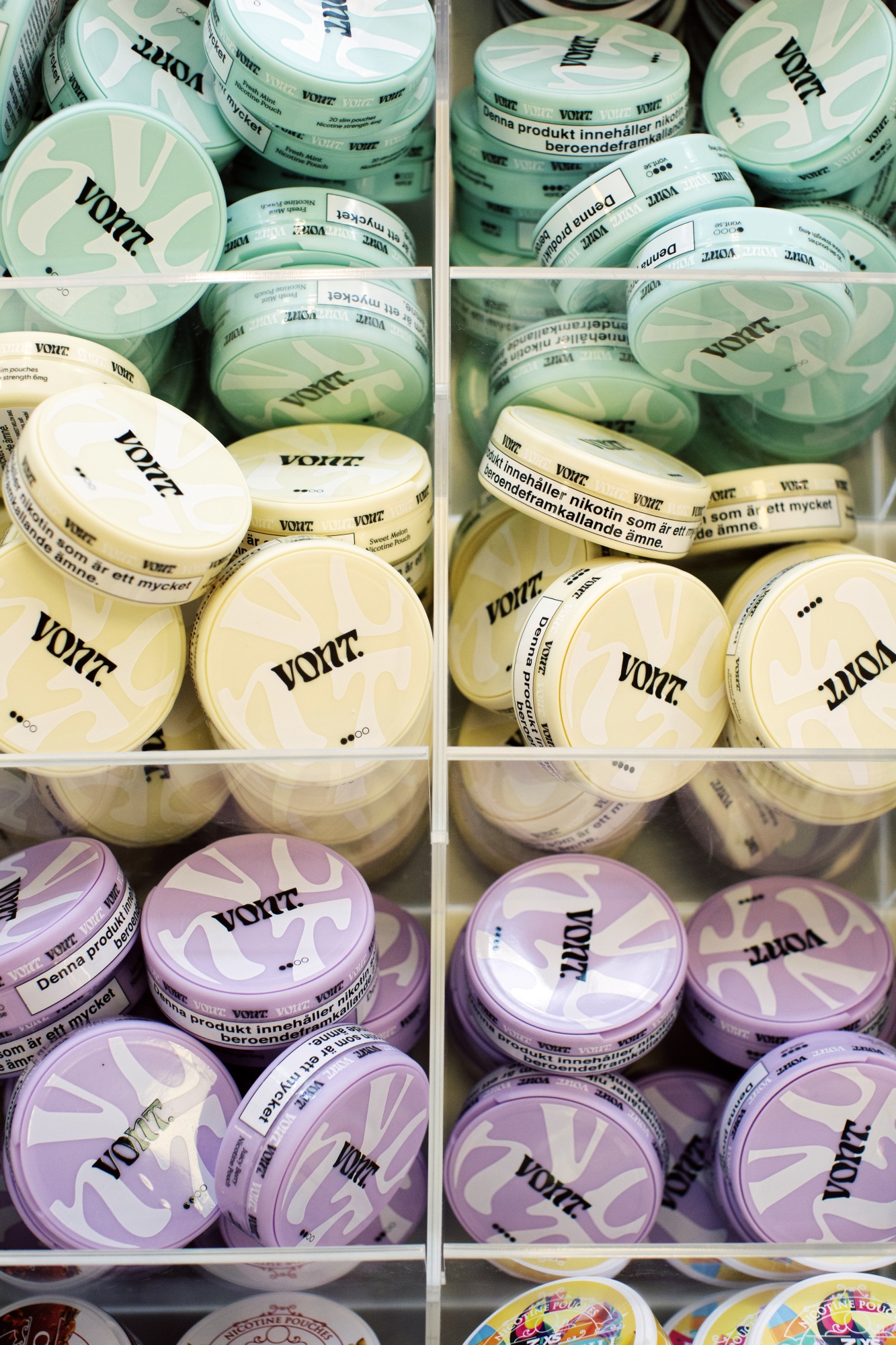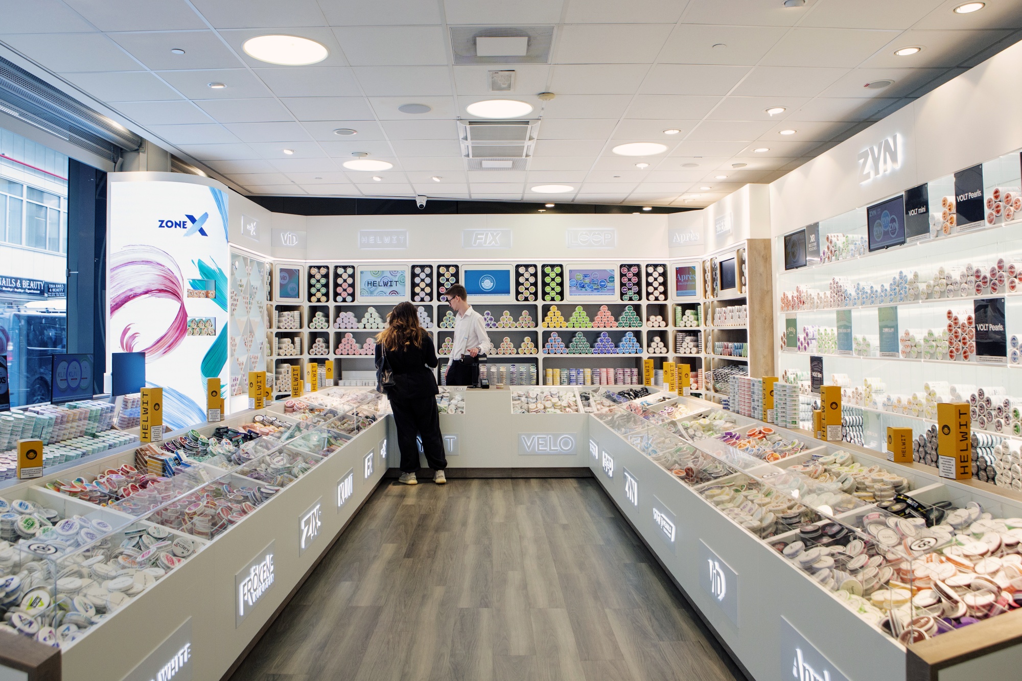 在斯德哥尔摩市中心的瑞典口腔烟草零售商Nikoteket的店面看起来更像是苹果专卖店而不是烟草店。超过400种口腔烟草和尼古丁袋诱使游客走进明亮的商店,那里出售着包括苹果鸡尾酒、可乐、樱桃和奶酪等口味的彩色罐头。还提供电子烟;不卖香烟。