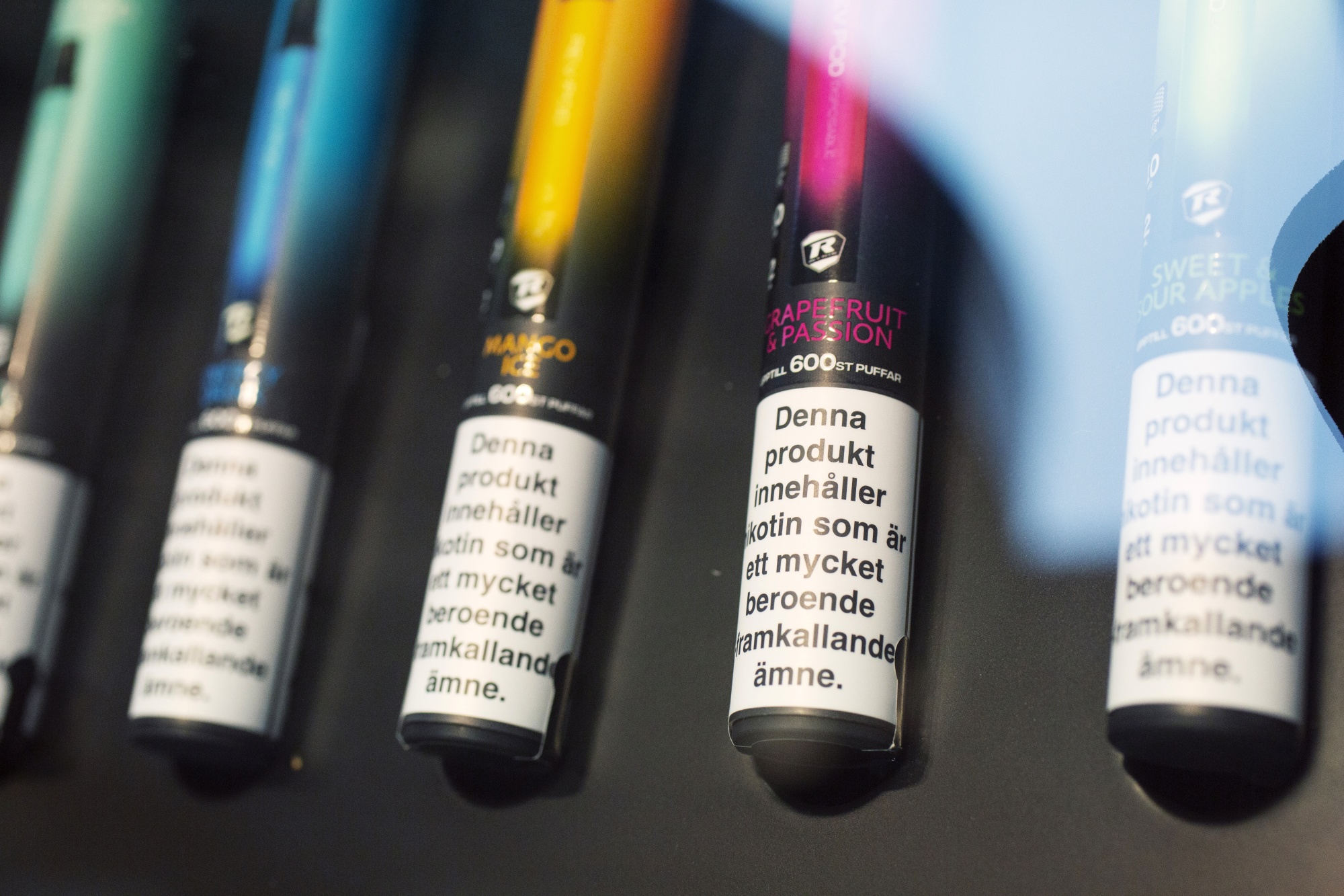 各种带有警告“本产品含有尼古丁,是一种极易上瘾的物质。”的电子烟摄影师:Erika Gerdemark/Bloomberg其中一些人留意到的是大烟草公司,直到最近还将瑞典口含烟草和其他香烟替代品视为生存威胁。
