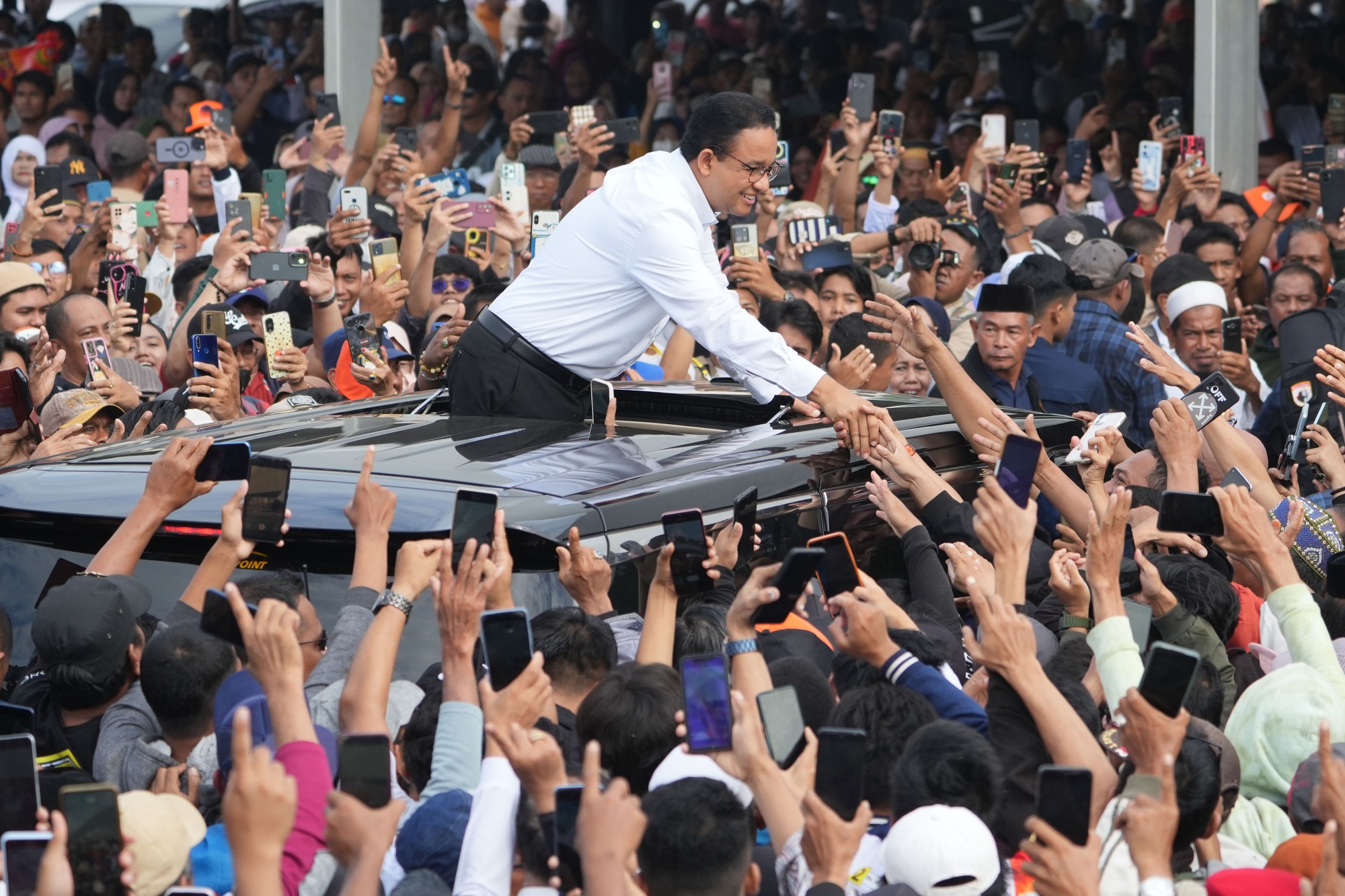 安尼斯·巴斯韦丹在竞选集会上。摄影师:迪马斯·阿迪安/彭博社他在苏拉威西岛的一次竞选活动前表示:“让我们不要过早下结论——我们还不知道结果。”“我们专注于2月14日。我们希望获得尽可能多的支持。”