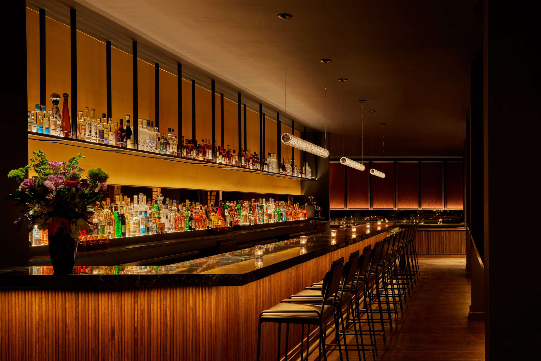 内部由Rockwell Group设计。摄影师:Jason Varney这个黑暗、高挑的空间,由David Rockwell设计,包括裂开的石膏墙板,意在潜意识中唤起炸鸡的表面,以及一条照亮的金色拱门隧道,也许会让人联想到镀金的鸡舍。入口处立即设有一个洗手站,提供奢侈的肥皂品牌和椭圆形镜子(鸡和鸡蛋是显著的视觉图案),以便清洁您的“餐具”,而无需绕道洗手间。餐厅后面的用玻璃门隔开的地下室里,可以看到红酒窖藏和香槟酒窖。