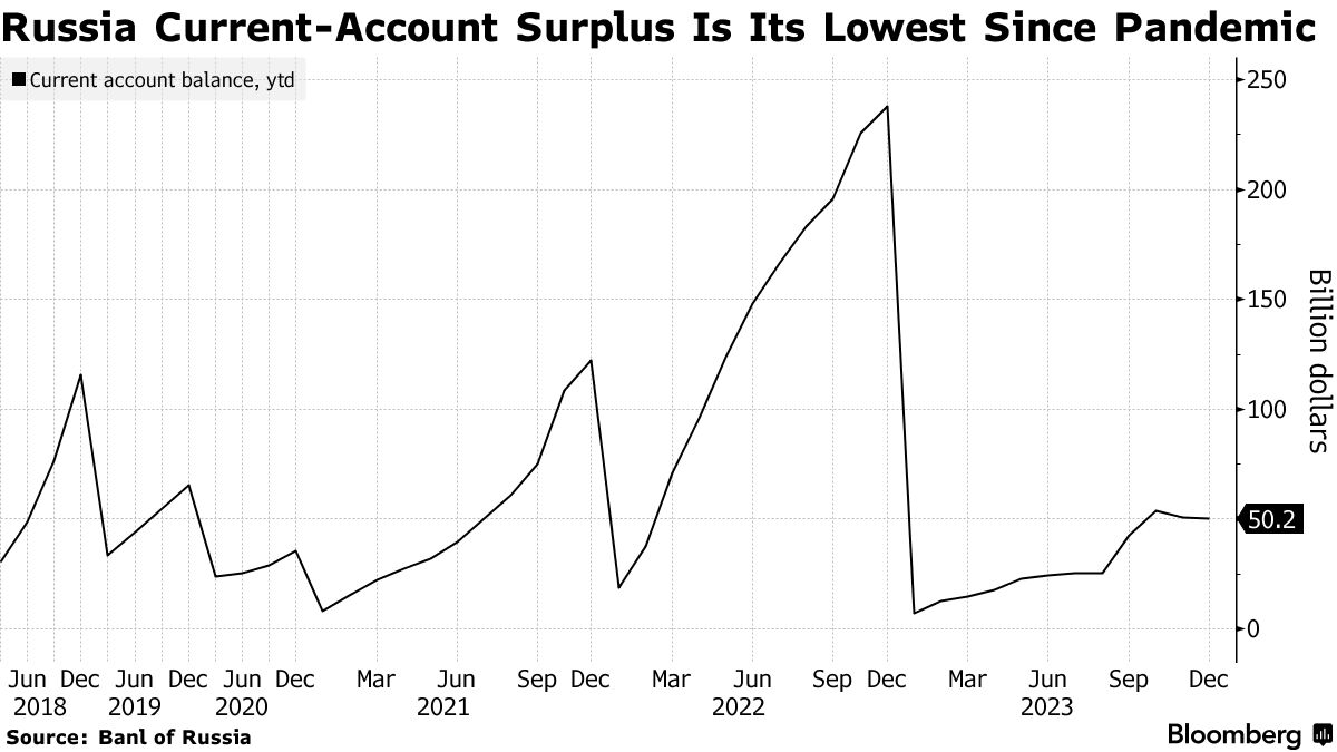 2023年,美国及其盟国对俄罗斯入侵乌克兰实施了全面制裁,导致俄罗斯出口收入受到限制,因此俄罗斯的经常账户盈余大幅下降。根据周五公布的初步中央银行数据,经常账户余额(即资金流入和流出之间的差额)去年仅为502亿美元,较2022年底的创纪录的2380亿美元大幅下降。这一减少甚至超出了官方的预期,并使年度盈余降至自2020年疫情爆发以来的最低水平。