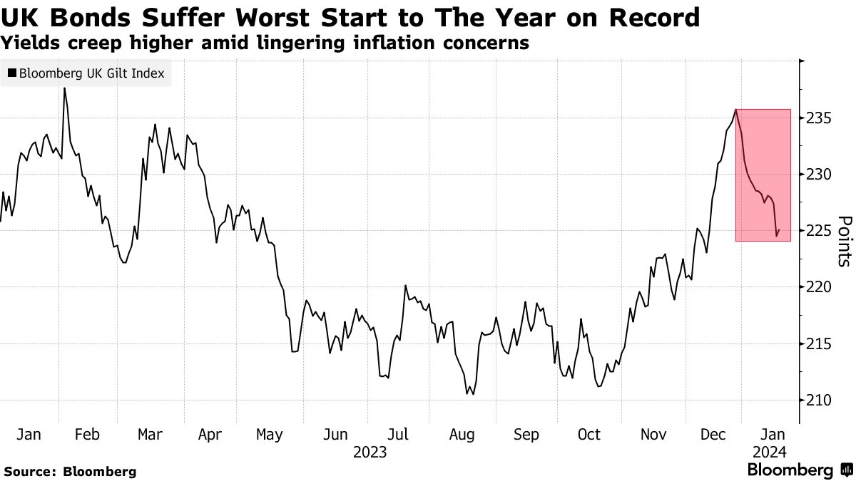 英国债券在今年出现了最大的下跌,这是在意料之外的通货膨胀激增之后,投资者重新考虑了英国央行能够降息的幅度。