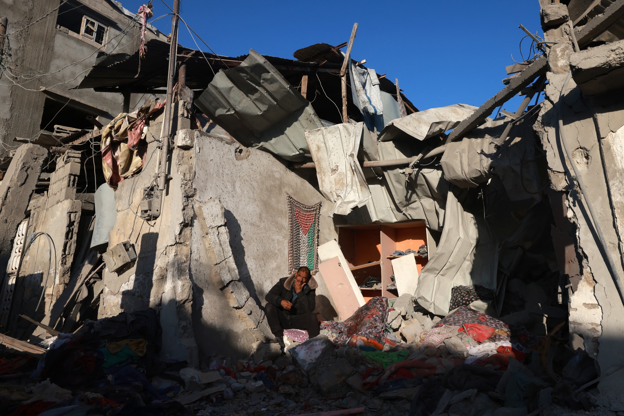 一名巴勒斯坦人坐在加沙拉法区一栋被以色列打击摧毁的建筑物的废墟中,摄于1月18日。来源:法新社/盖蒂图片社埃及外交部发言人艾哈迈德·阿布·赛义德表示:“有许多关于加沙未来的想法,包括重建。”