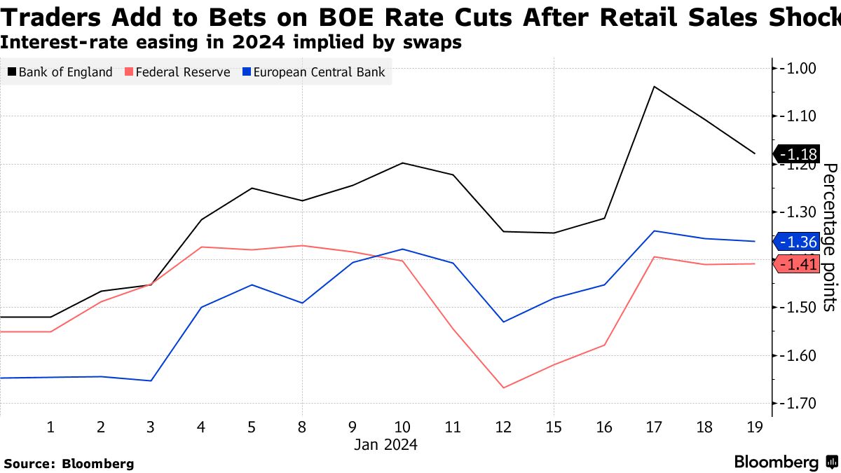 数据发布后,英镑下跌,结束了两天的涨势,兑美元汇率下跌0.2%,至1.2685美元。投资者加大了降息的押注,完全定价预计央行将在6月前实施首次0.25个百分点的降息,并在年底前至少再实施三次降息。
