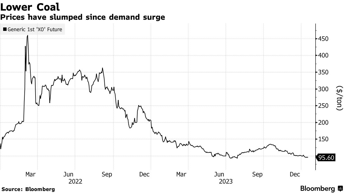 这种最脏的化石燃料的价格在2022年创纪录后暴跌了约70%。本周的一次火车碰撞几乎停止了向理查兹湾煤炭码头的供应,加剧了货运运营商Transnet SOC Ltd. 的困境。价格的暴跌使得通过卡车运输矿物到港口的套利空间变窄。