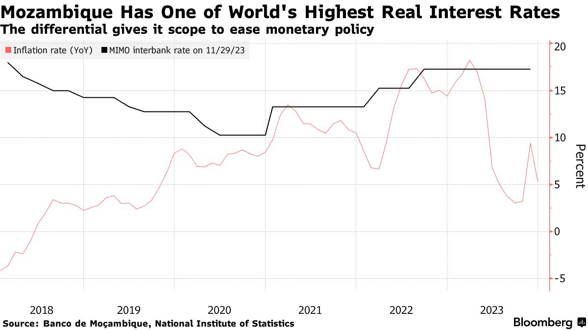 加纳和莫桑比克等较小的经济体可能会在2024年上半年放宽货币政策,因为它们的实际利率在通货膨胀调整后是世界上最高的。