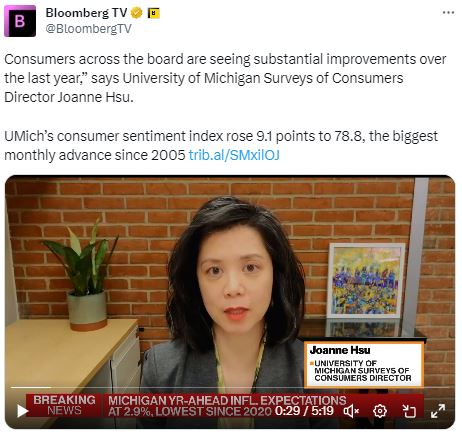 今天在彭博电视台的权力平衡节目中,主持人乔·马修和凯利·莱因兹采访了PWC华盛顿国家税务服务负责人Rohit Kumara,谈论正在通过国会的税收提案。从周一开始,观看权力平衡节目,时间为下午1点和下午5点。今天早些时候在彭博电视台上,密歇根大学消费者调查主任Joanne Hsu讨论了消费者情绪的上升。