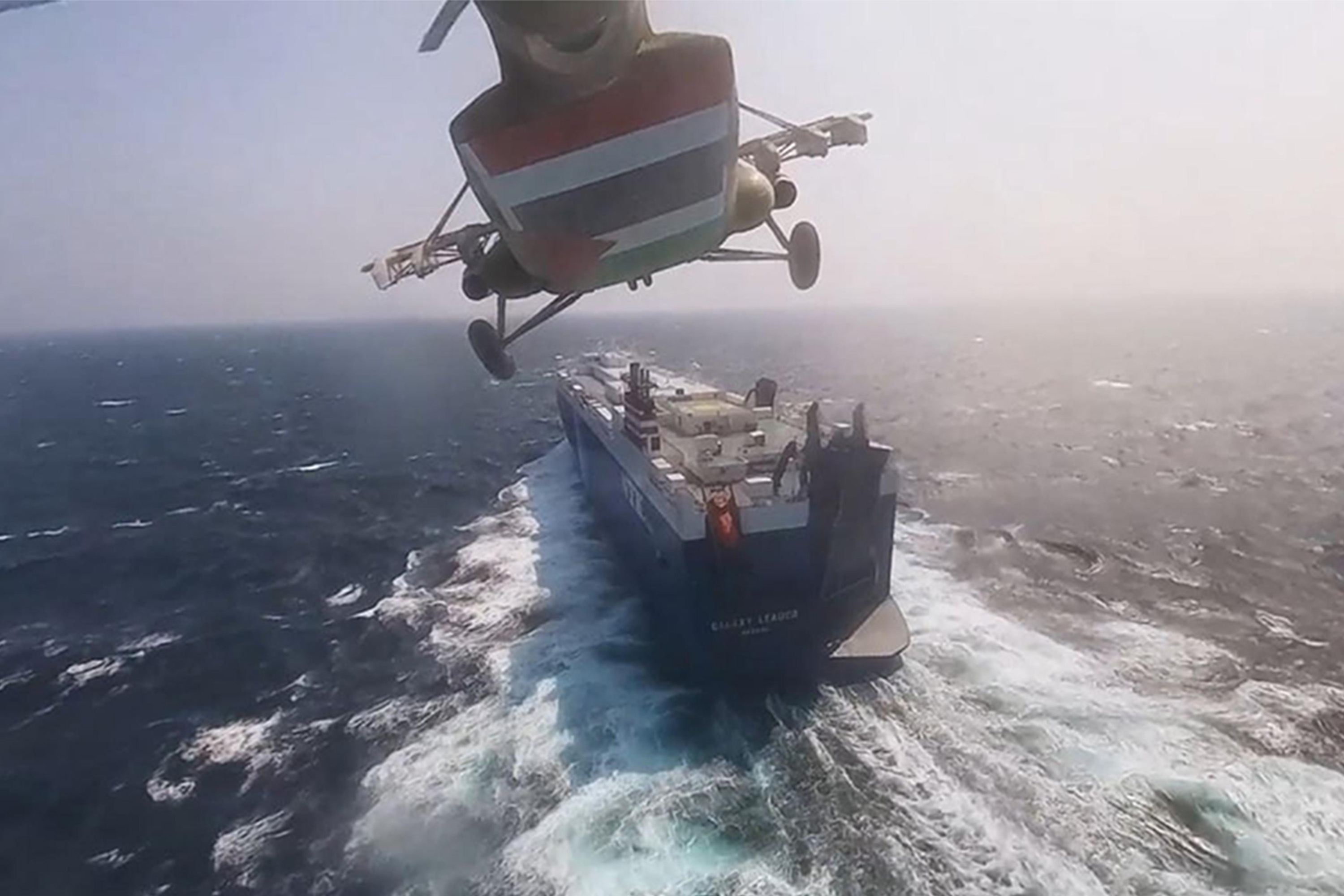 这是从视频中截取的一张手稿屏幕截图,显示也门胡塞武装分子在也门荷台达附近的红海上接管了“银河领袖”货船,时间为11月20日。来源:Getty Images