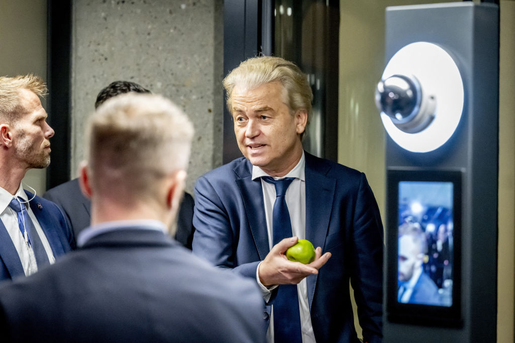 格尔特·维尔德斯于2023年12月21日在海牙手持一个苹果。摄影师:罗宾·乌得勒赫特/法新社但维尔德斯能否成功地将自己重新定位为一个更温和的选项,将由其他三个政党来决定:中右翼保守派NSC、自由右翼VVD和保守派农民公民运动。他们已经与他在谈判桌前坐了一个多月,但并没有离开。
