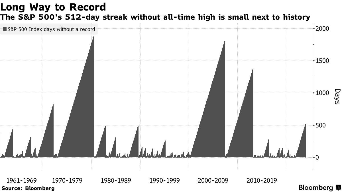 从2022年1月的上一次纪录到现在,经历了512个交易日。根据彭博编制的数据,这是十多年来最长的干旱期。