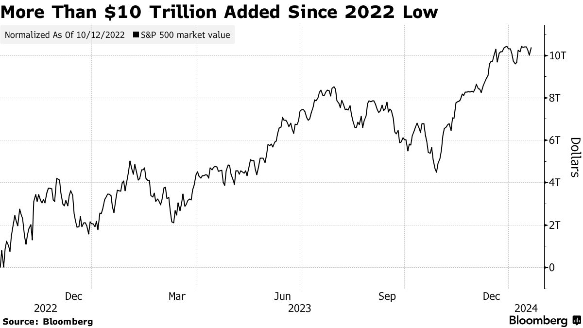 在两年前达到峰值后,标普500指数的价值下跌了四分之一,最终在2022年10月12日收盘时跌至3577.03点。自那时起,它已经增加了超过10万亿美元的市值,同时从2022年的抛售中反弹,这是自2008年金融危机以来该指数表现最糟糕的一年。